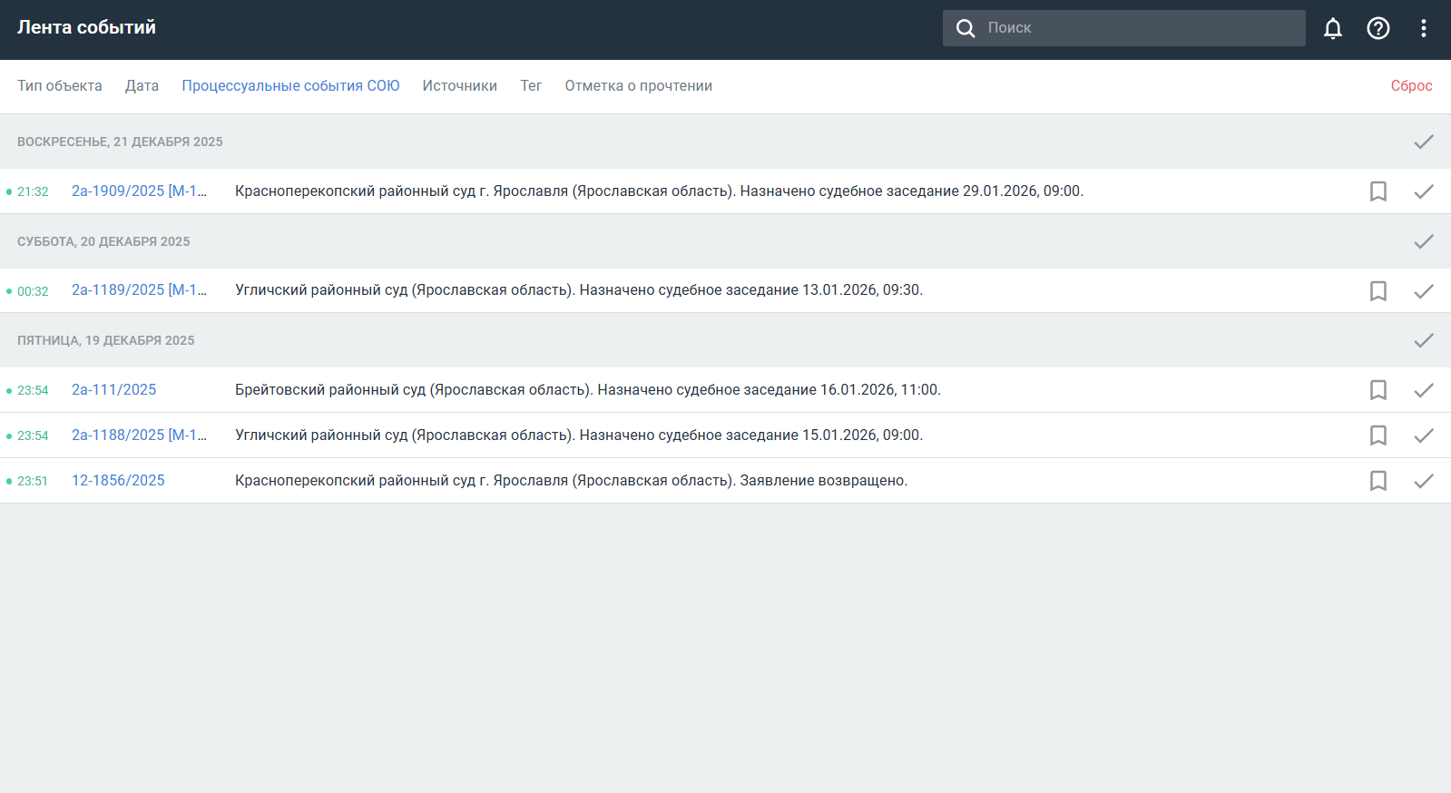 В ленте отображаются основные события по делам, компаниям, персонам и судьям из ваших подборок. Информация о событиях обновляется в режиме реального времени. Новые события в ленте появляются без перезагрузки страницы.