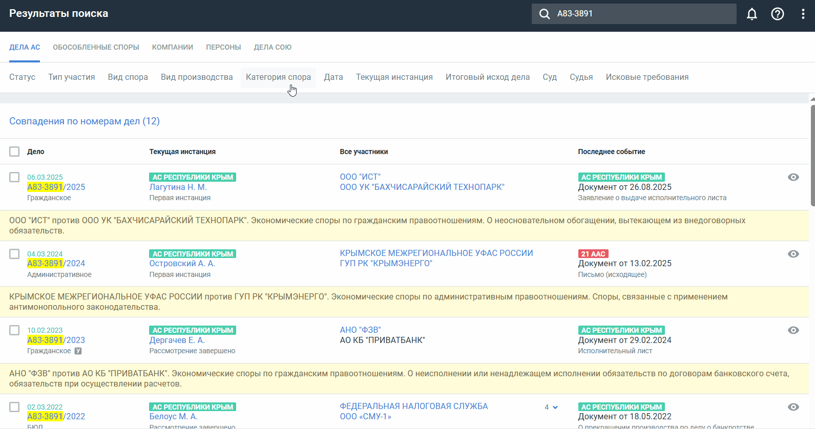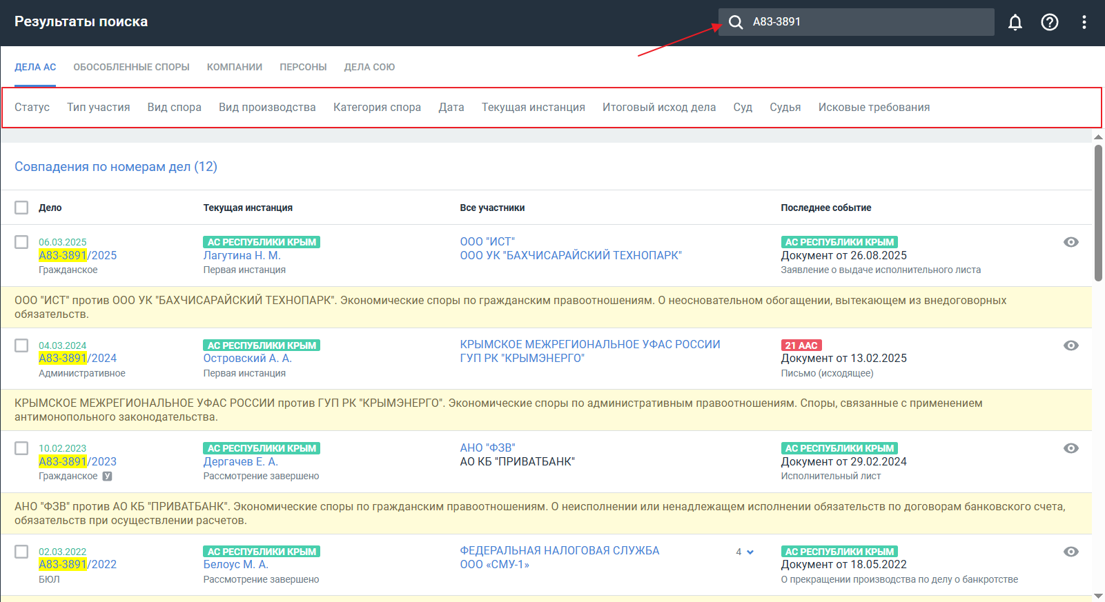 Откройте расширенный поиск по делам, ОС, компаниям, делам СОЮ или персонам.