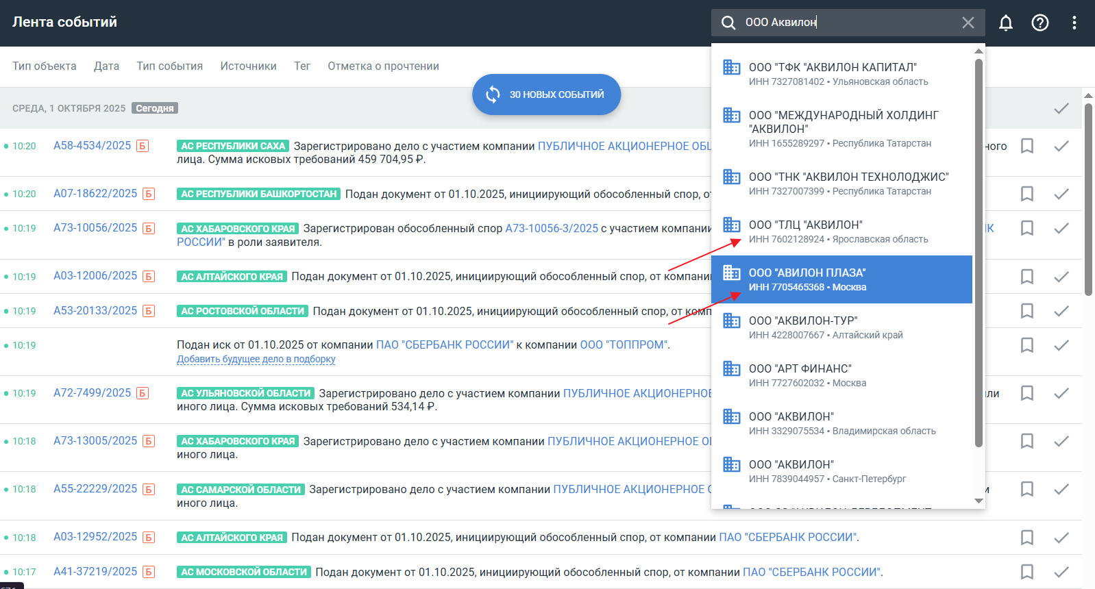 Если система найдет новое дело, подходящие под заданные условия, в ленте появится соответствующее событие. При отключении уведомления о новых делах приходить не будут.