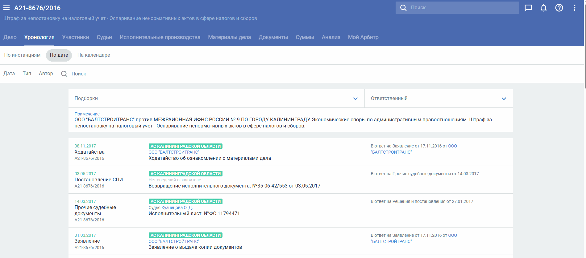 В карточке дела доступна хронология процессуальных событий по инстанциям, в которых рассматривалось дело.