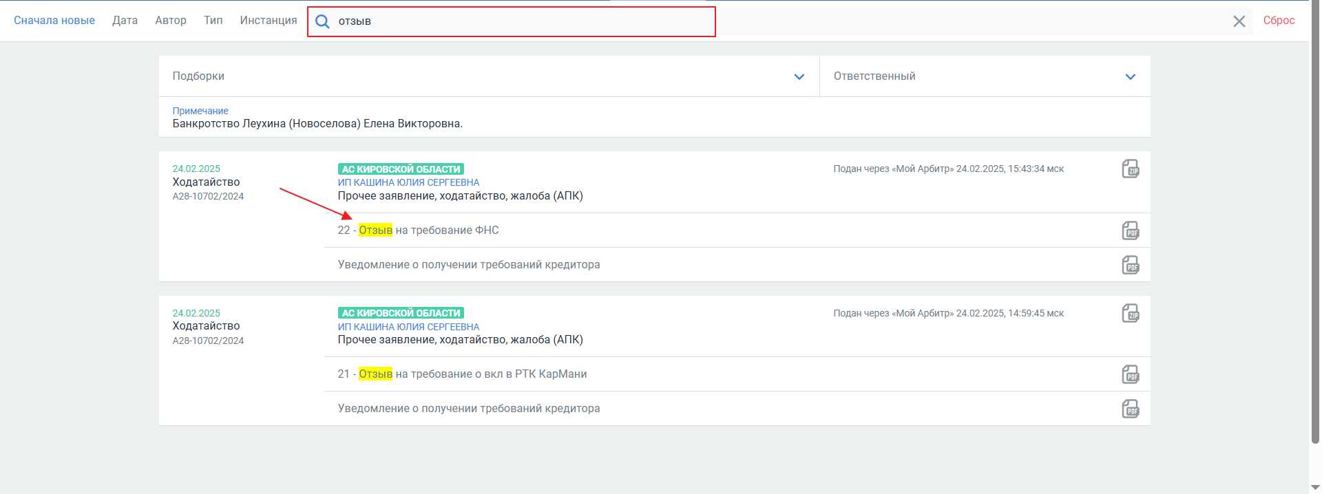 Воспользуйтесь фильтрами и/или впишите ключевые слова в строку быстрого поиска. Строка быстрого поиска доступна только в разделах По дате,По инстанциям, По обособленным спорам (только в банкротной карточке). Поиск осуществляется среди всех событий по всем текстовым атрибутам событий (в том числе по датам):