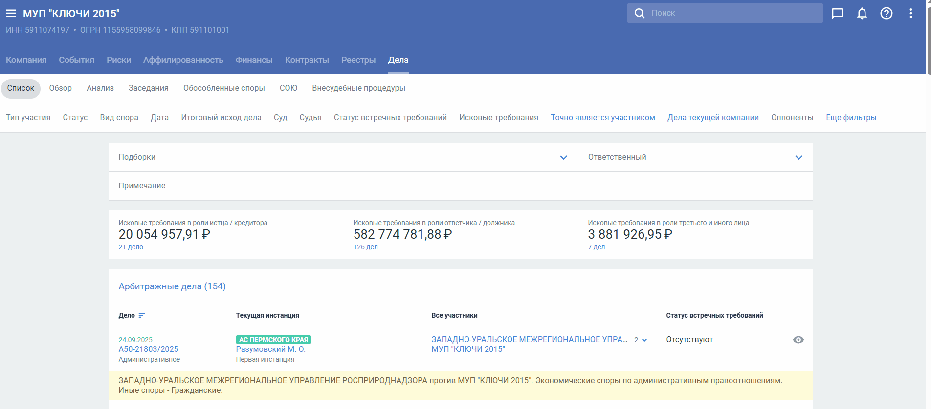 Для оценки надежности компании пользователи Casebook могут посмотреть отчет по организации в разрезе рисков.