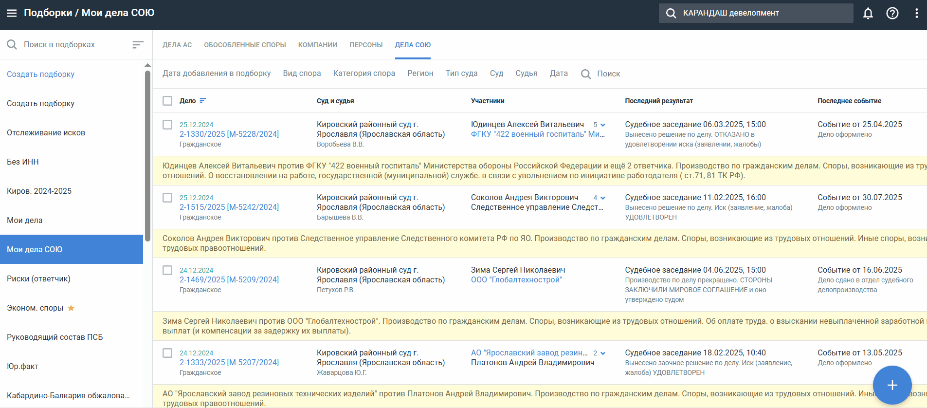 Можно сформировать подборки по интересующим делам СОЮ. Если в деле произойдут изменения, вы будете оповещены об этом в ленте событий и в почтовой рассылке.