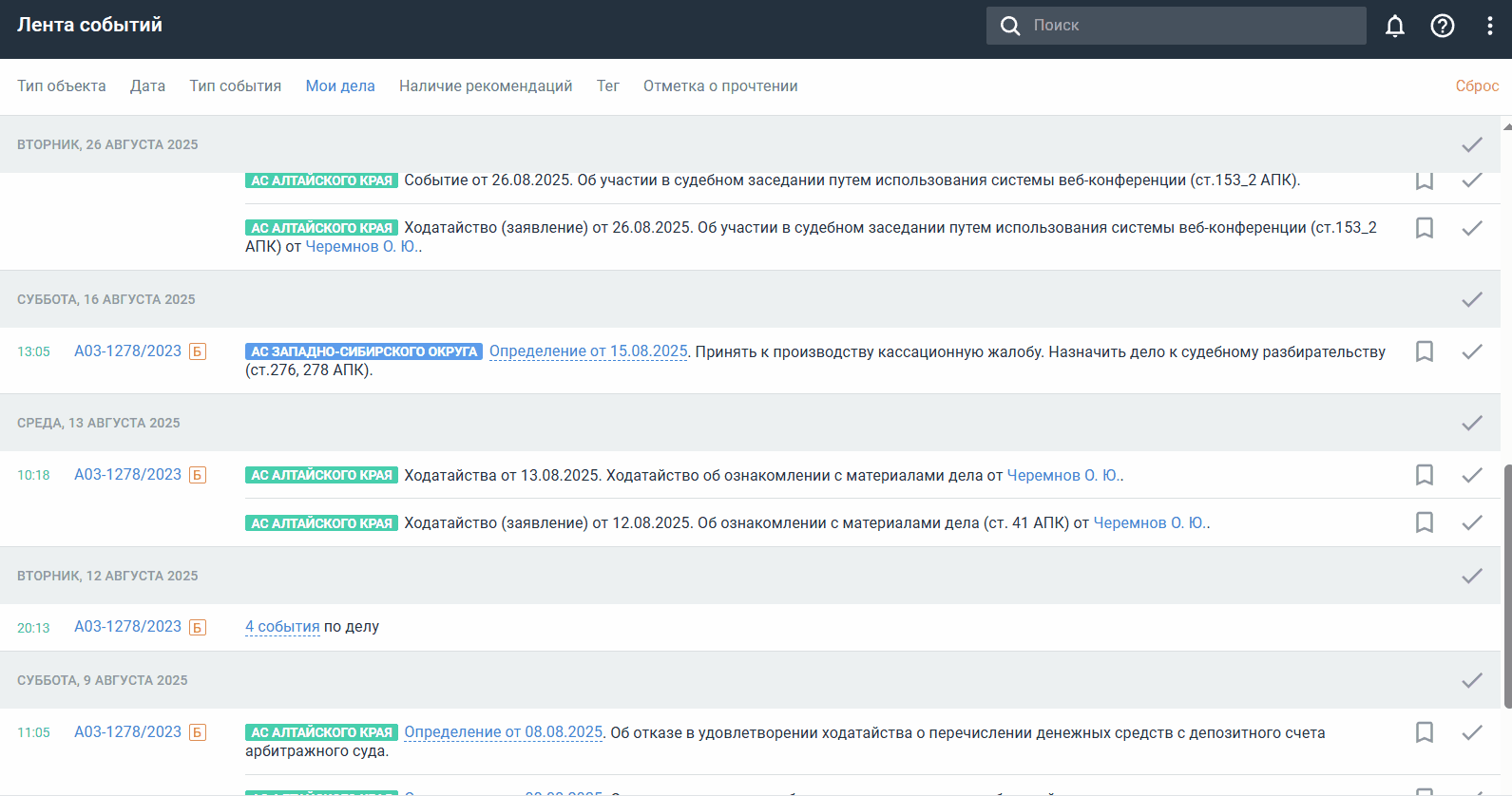 - Документ в хронологии дела - откроется карточка дела, по которому произошло событие, на вкладке Хронология на строке с документом, из которого был выполнен переход из Ленты событий.