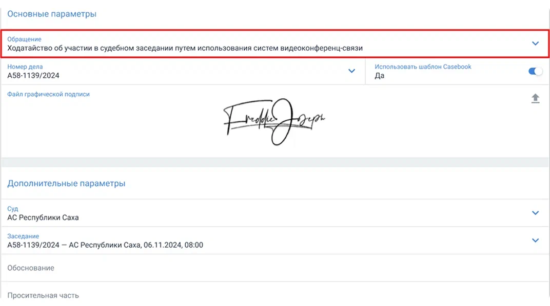Загружать основной файл стало удобнее - просто перетащите его в карточку обращения. Подавать ходатайство об участие в заседании по ВСК теперь можно прямо из системы.