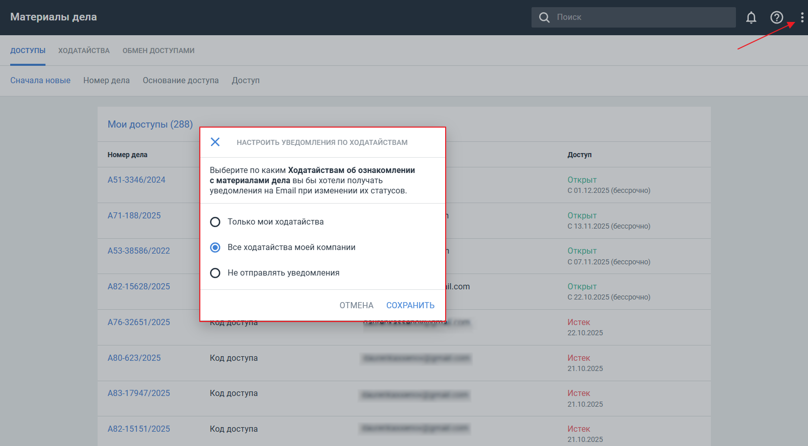 Чтобы настроить получение уведомлений о ходе рассмотрения ходатайств, в разделе Материалы дела нажмите кнопку меню-троеточия в правом верхнем углу и выберите пункт "Настроить уведомления по ходатайствам". В открывшемся окне выберите нужный вариант: