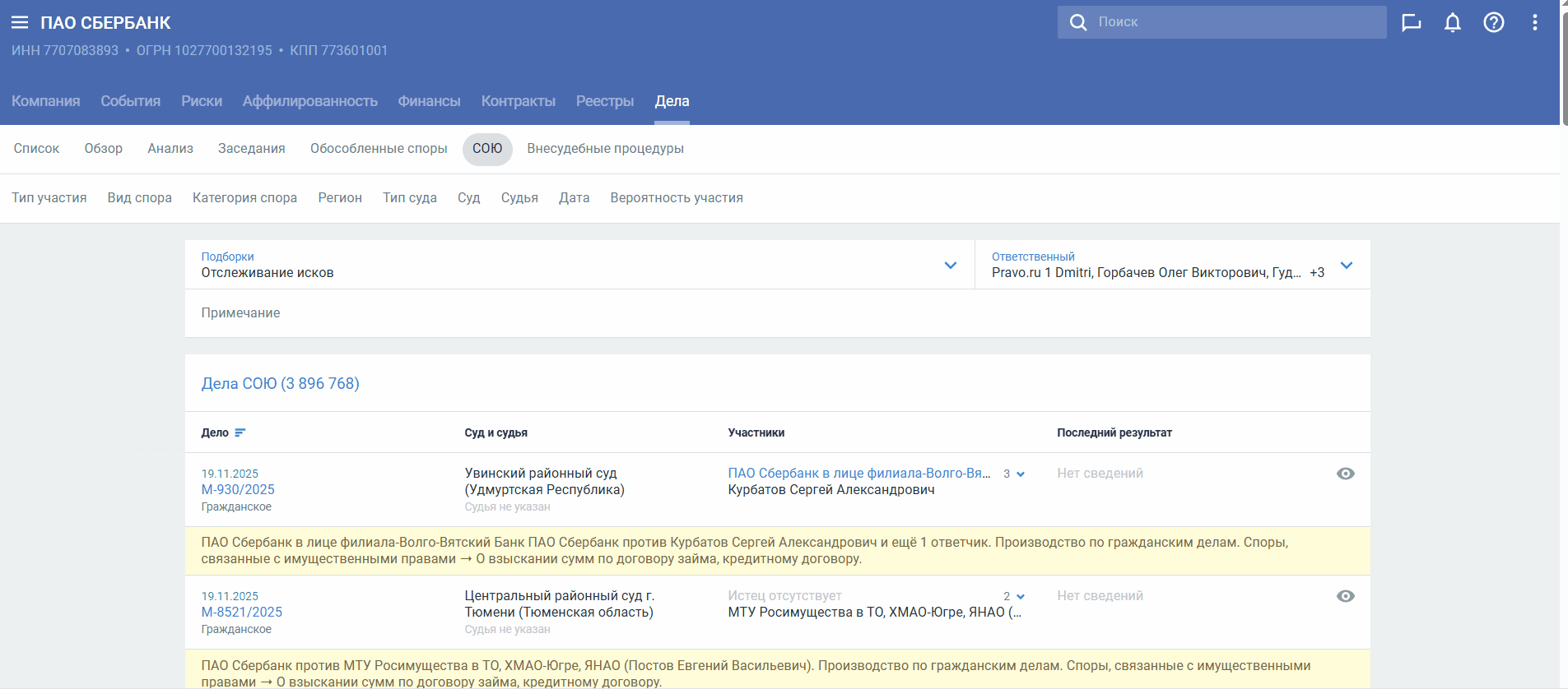 Вы можете ознакомиться со списком дел с участием компании, рассматриваемых в судах общей юрисдикции. Список дел СОЮ находится на вкладке СОЮ и отсортирован по дате регистрации дел (от более поздних к более ранним). Можно отфильтровать данные по делам СОЮ по типу участия, виду спора, категории спора, региону, типу суда, судье, дате (в т.ч. и дате рассмотрения) и вероятности участия.